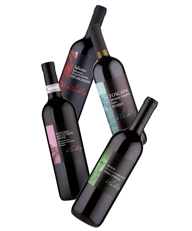 Dall’Oltrepò pavese alla Toscana, passando per il Salento e la Sicilia, nella linea dei vini rossi Le Vie dell’Uva è rappresentata tutta l’Italia, con il suo sapiente patrimonio vitivinicolo storico. I prodotti di questa linea sono tutti rigorosamente Doc e Igt, legati quindi a doppio filo ai loro territori d’origine, dal quale hanno assorbito le caratteristiche: la luce del sole che ha illuminato le vigne, le piogge che le hanno bagnate e i minerali che la terra di ciascun luogo ha generosamente saputo offrire.